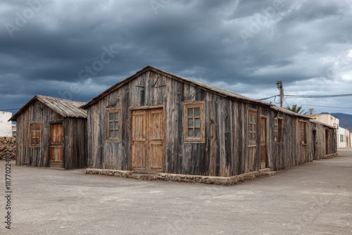 Aged wooden structures in Cabo de Gata Almeria under a cloudy sky that highlights their sun faded textures and vintage appeal