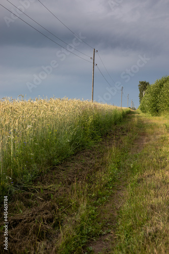 agricultural field where rye grows, landscape of agricultural crop rye backlit with sunset golden light, before storm
