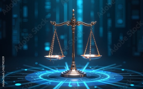 Ai and scales hologram, artificial intelligence in law concept. High quality