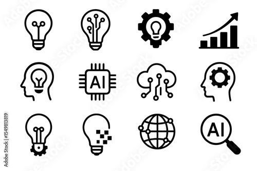 ai, technology, icon, light bulb, design, gear, circuit, growth, innovation, digital, network, datum, chips, cloud, progress, head, creativity, idea, tech, future, computing, intelligence, development, symbol, connection, abstract, modern, interface, black, white, simple, advancement, vector, icon