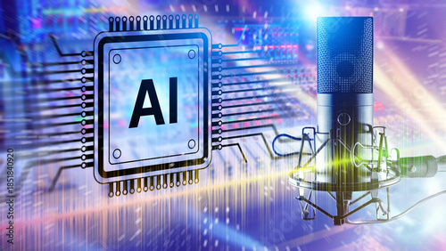 AI audio technology, digital voice production. Microphone and artificial intelligence processor visualize speech synthesis, sound analysis, and smart voice systems for media and IT.