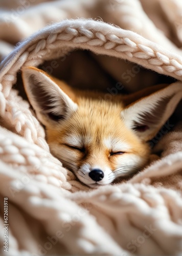 fox, brown, sleeping, peaceful, blanket, warm, curled, cosy, snug, serene, soft, furry, tranquil, restful, calm, gentle, peacefulness, comforting, placid, slumbering, cushioned, content, relaxed, safety, warmth, shelter, cuddled, napping, dreamy, security, relaxing, protected, ai, generative, illustration, digital, art