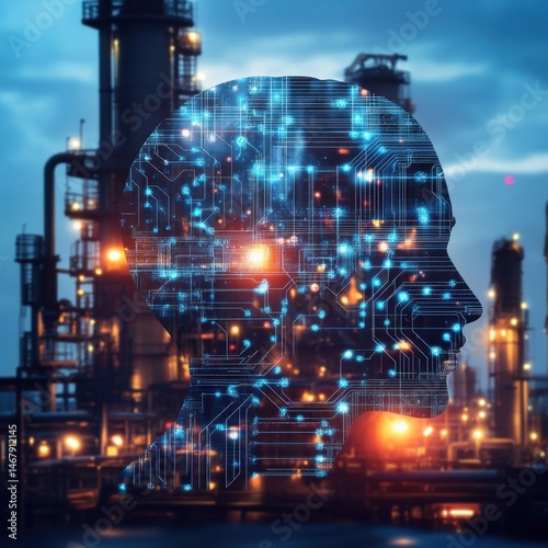 head, silhouette, circuit, board, light, glow, factory, to illuminate, modern, abstract, digital, dark, night, industrial, futuristic, concept, technology, innovation, development, energy, plant, pipeline, structure, metal, sky, blue, orange, complex, connected, intelligent, network, system, shape, outline, vertical, artificial, intelligence, automation, engineering, production, illustration, visualisation, background