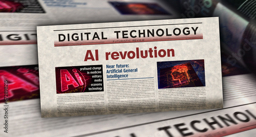 artificial intelligence, technology, ai, innovation, revolution, danger, news, newspaper, paper, headline, breaking, media, background, print, article, concept, press, gazette, digital, cyber, threat, change, android, robot, worry, abstract, retro, vintage, report, review, machine, printing, three-dimensional, illustration