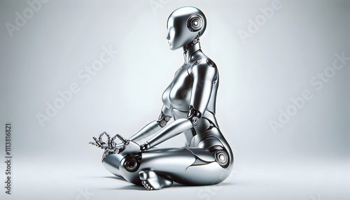 AI Robot Background A stylized female robot with a smooth, chrome-like surface, sitting in a meditative pose, isolated o1