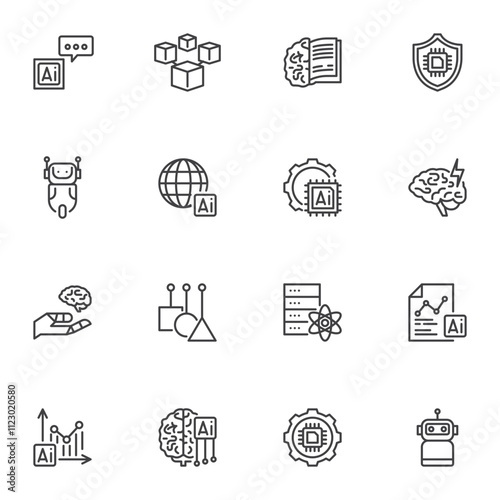 ai, technology, icon, set, collection, pack, line, stroke, outline, linear, vector, element, logotype, pictogram, flat, symbol, signs, web, illustration, pixel, honed, simple, editable, graphic, hollow, intelligence, robot, brain, artificial intelligence, artificial, engineering, innovation, connection, computer, analysis, analysing, automation, learning, digital, machine, gear, smart, system, tech, chat, database, brainstorming, management, service