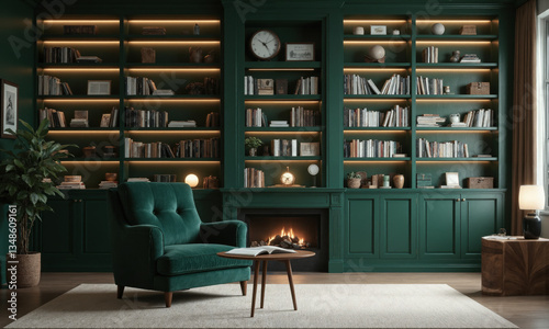 AI-assisted home library in deep emerald, with interactive bookshelves that suggest new reading materials based on past interests. The space
