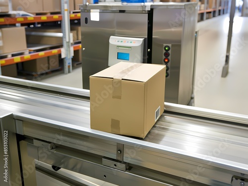 AI-Generated image of A box is on a conveyor belt in a warehouse. The box is brown and has a barcode on it