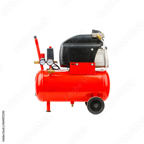 Air Compressor close-up: A detailed, close-up shot showcases a powerful, vibrant red air compressor, emphasizing its robust design and functionality.