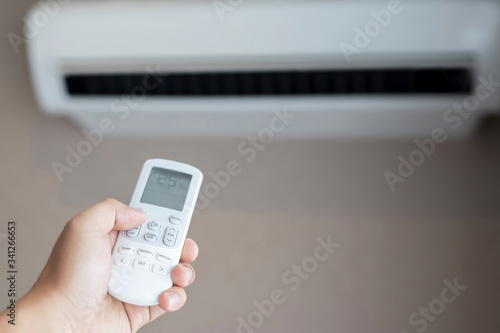 Air conditioner inside the room with close up man hand holding using directed operating remote controller.
