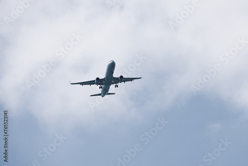 Airplane flying in sky with clouds. Passenger plane at flight, travel concept