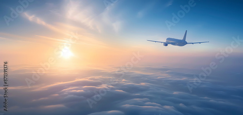 Airplane flying over clouds during a beautiful sunrise, showcasing the serene and peaceful view from above the sky in high contrast lighting.