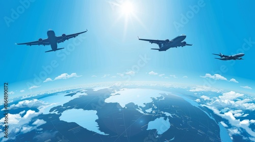 Airplanes Flying Over Globe with Blue Sky and Clouds Symbolizing Global Travel