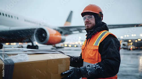 Airport worker in safety gear handling cargo near an airplane on a snowy tarmac during winter operations