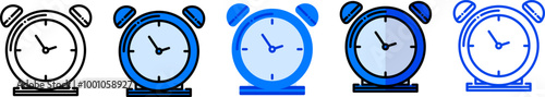 Alarm clock icon set in five styles, suitable as a countdown, alarm, time, and timer symbol.