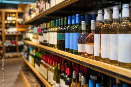 Alcohol business concept, wine bottles in a row on the shelf of wine shop.