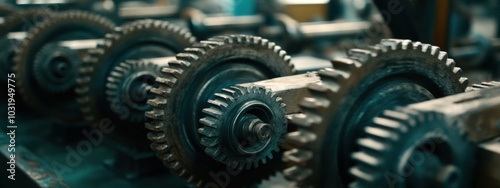 Aligned Industrial Gears, a series of uniform mechanical components showcasing precision and engineering excellence in a factory setting