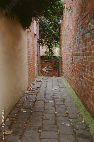 alley, analog, analog, arrow, brick, cobbled, direction, film, inner city, lane, laneway, narrow, painted, pavement, street, streetscape, paseo, wall