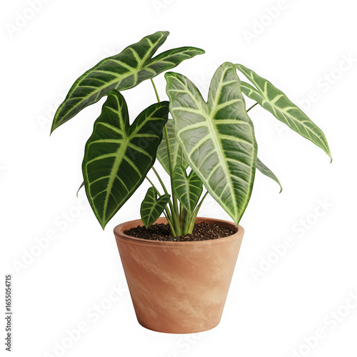 Alocasia amazonica plant in a terracotta pot isolated on transparent background