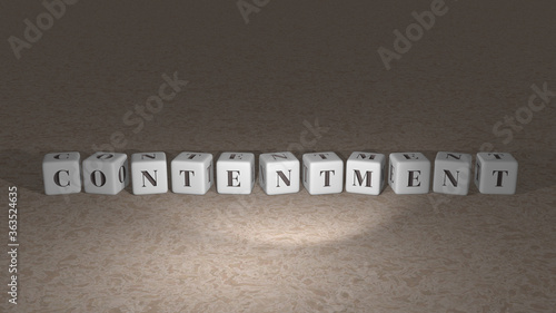 alphabetic CONTENTMENT arranged by cubic letters on a mirror floor, concept meaning and presentation in 3D perspective. happy and business
