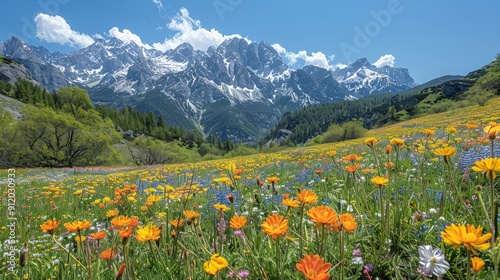 alpine, meadow, mountain, snow, peak, wildflower, flower, landscape, nature, summer, grass, sky, green, blue, sunshine, bright, colourful, beautiful, scenery, idylli, tranquil, peaceful, serenity, flora, foliage, tree, forest, panorama, outdoors, hiking, adventure, travel, journey, vacation, fresh, blooming, vibrant, spring, abundant, natural