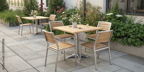 patio, aluminium, wood, furniture, set, table, chair, square, garden, eatery, design, metal, frame, wicker, rattan, summer, relax, comfort, style, modern, contemporary, vintage, rustic, elegant, hard-wearing, lightweight, strong, maintenance, easy, clean, weatherproof, sunny, green, plant, flower, landscaping, seating, dining, conversation, entertainment, hospitality, aesthetic, ambience, calmness, space, area, deck