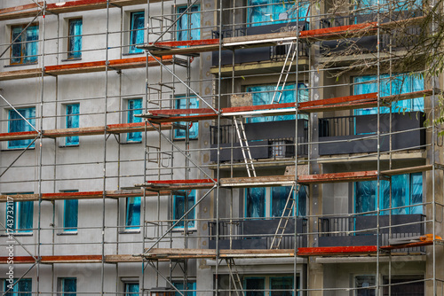 renovation, construction, building, block, scaffolding, disassembly, assembly, danger, security, metal, aluminium, insulation, painting, men at work, thief, thieving, rigging, poland, thermal insulation, ecology, work, architecture, engineering, industry, labor, exterior, pole, building construction, activity, concrete, floor, support