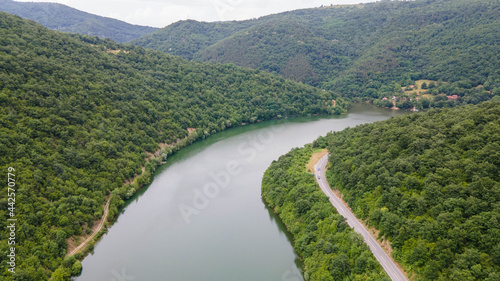 Amazing aerial shot of beautiful blue Tara river. Forest background.