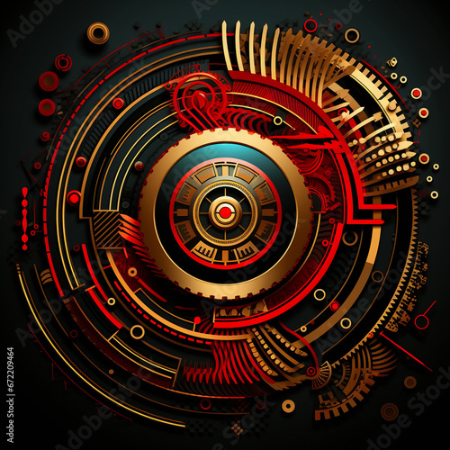Amazing electronic vector design with gold red and black colours with good details. A sci-fi alien tech pattern texture. Metal intricate detail. Wall and floor with different textures, and cracked.