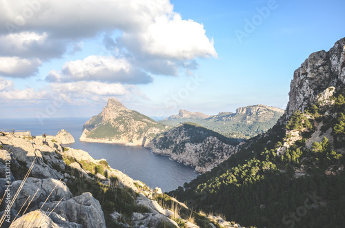 Amazing view from Mirador Es Colomer in Cap de Formentor, Mallorca, Spain. Cliff formations in the Mediterranean. Rocks by the sea. Spanish tourist attraction and popular viewpoint