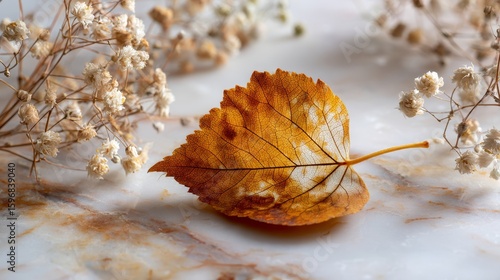 Amber aspen leaf on marble surface with dried flowers. Elegant autumn table setting