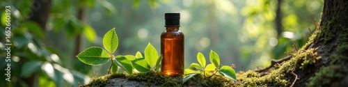 Amber glass bottle in sunlit forest with fresh green leaves