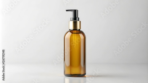 bottle, amber, glasses, pump, dispenser, cardboard box, cosmetic, product, container, liquid, beauty, skincare, clean, background, white, studio, isolated, transparent, template, design, object, shape, texture, material, brown, gold, vertical, minimal, simple, elegant, illustration, photo, commercial, marketing