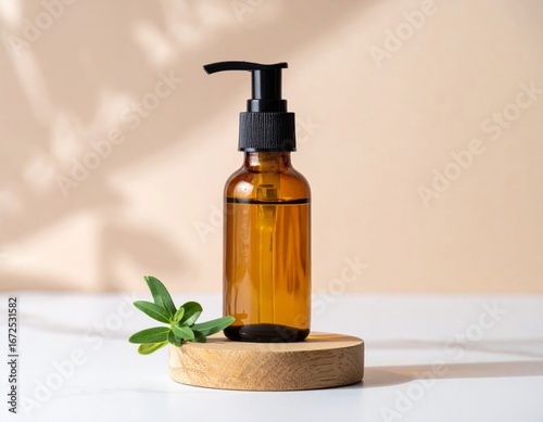 Amber Glass Bottle with Pump on Wooden Stand with Green Leaf in Studio Lighting