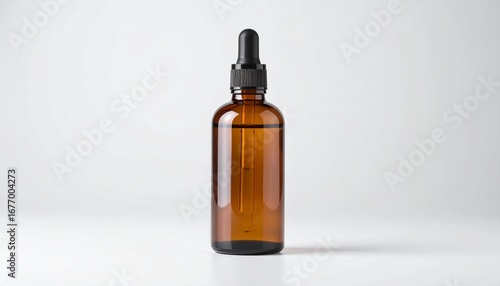 Amber glass dropper bottle with black rubber top and pipette on white background