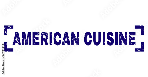 AMERICAN CUISINE title seal stamp with corroded texture. Text caption is placed between corners. Blue vector rubber print of AMERICAN CUISINE with corroded texture.