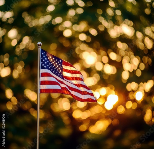American flag waving gently in the breeze with a warm, golden sunset backdrop and soft bokeh effects creating a serene and patriotic atmosphere