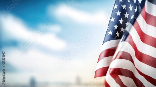 American flag waving proudly against a soft blurred background, with an open banner space for text or design. This patriotic scene provides a perfect setting for celebrating national holidays or promo