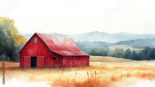 American watercolor drawing of a barn in a field.