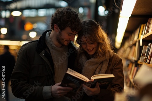 couple, reading, bookshop, evening, cosy, romance, winter, together, book, love, smile, exploring, casual clothes, hair, jacket, indoor, happiness, connection, literature, laughter, sharing, moment, young adult, engagement, friends, relationship, nostalgia, intimate, discovering, bookish, companionship, adventure, urban, young love, joy, literary, happy, interaction, heartwarming, togetherness, life events