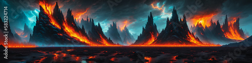 An abandoned hellish landscape with lightning and fire, and glimpses of mountains in the background.. Generative AI