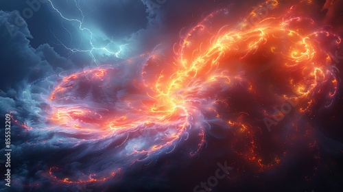 An abstract design of electric spirals with a dynamic, energy-themed background. The electric spirals glow brightly, surrounded by lightning bolts and energetic waves.