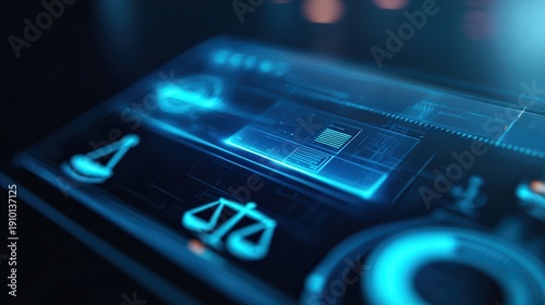 An abstract representation of the legal system, with luminous technology interface displaying key aspects. ..Created with Generative AI, not depicting real subjects.