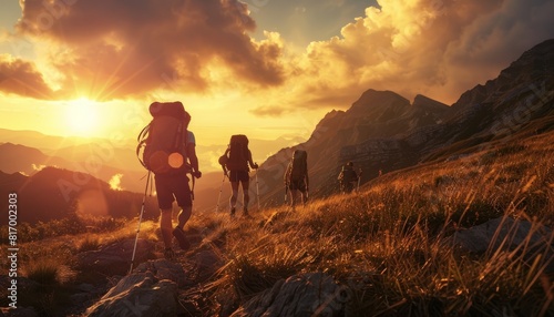 An adventurous mountain hiking scene with a group trekking at sunset, capturing the essence of travel and outdoor exploration