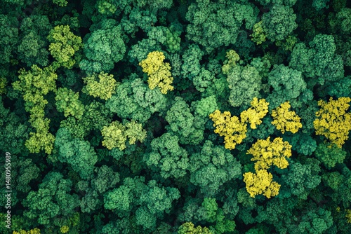 An aerial perspective of the forest showcases nature's stunning design. Green and yellow trees with vibrant color, creating a mosaic of texture and tones in the forest.