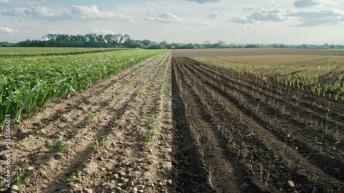 An agricultural landscape shows the contrast between tilled soil and growing crops under a bright, expansive sky.