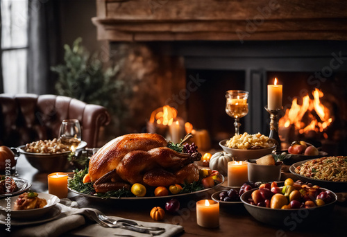 turkey, vegetable, candle, thanksgiving, wooden, fireplace, holiday, dinner, roasted, traditional, cosy, festive, warmth, homelike, welcoming, hearth, flames, merry, gathering, comfort, relaxation, contentment, joy, joyous, serenity, peaceful, aromatic, inviting, table, delight, ai, generative, illustration, digital, art