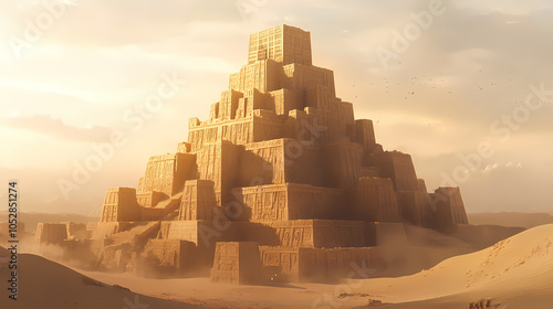 An ai-generated depiction of a babylon-like tower rising amidst a desert landscape, evoking the grandeur of an ancient civilization. Ancient Babylonian City. Illustration