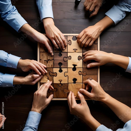 An AI-generated image showcasing the close-up view of business people fixing large dark brown wooden puzzle pieces together on a grey desk. The image captures the essence of teamwork, collaboration,