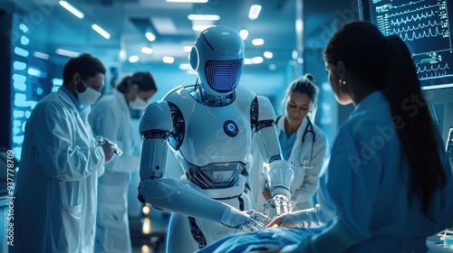 An AI-powered robot assisting in a medical procedure, surrounded by doctors and nurses, set in a high-tech hospital environment with a blend of cool and warm lighting